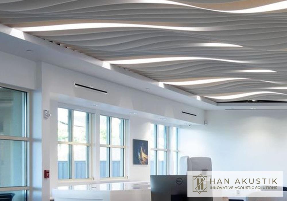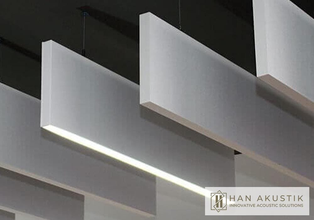 It is a system of vertically suspended baffle panels covered with acoustic fabric panels, designed to improve both sound absorption and interior aesthetics.