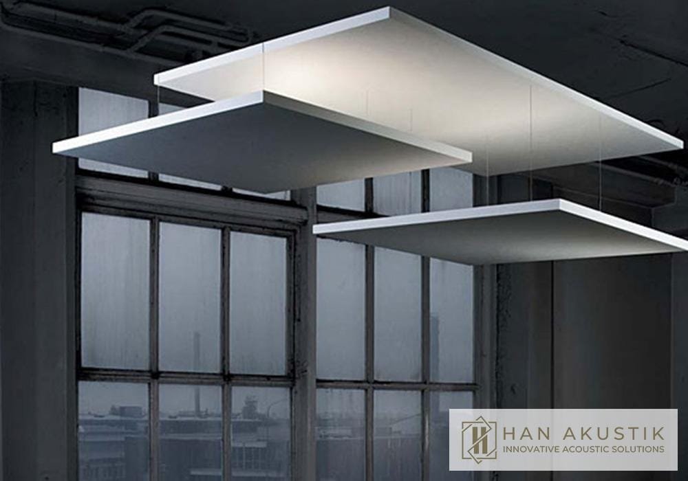 A sound insulation panel installed by suspending it from the ceiling, offering both aesthetic and functional benefits.
