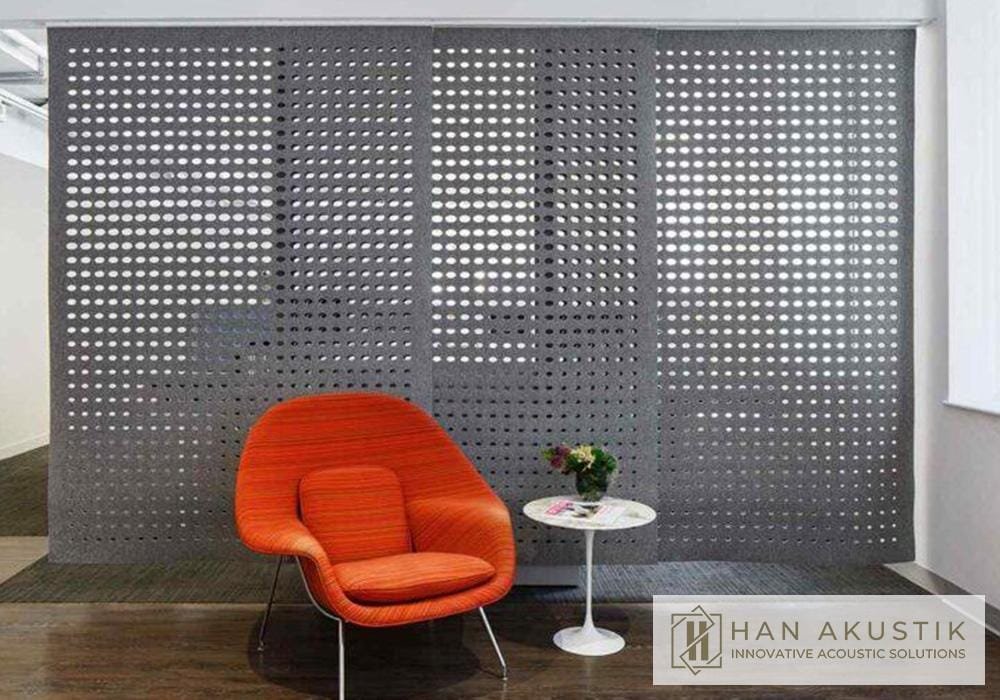 Linear acoustic mesh felt curtains efficiently absorb sound waves, reducing echo and enhancing acoustic comfort.